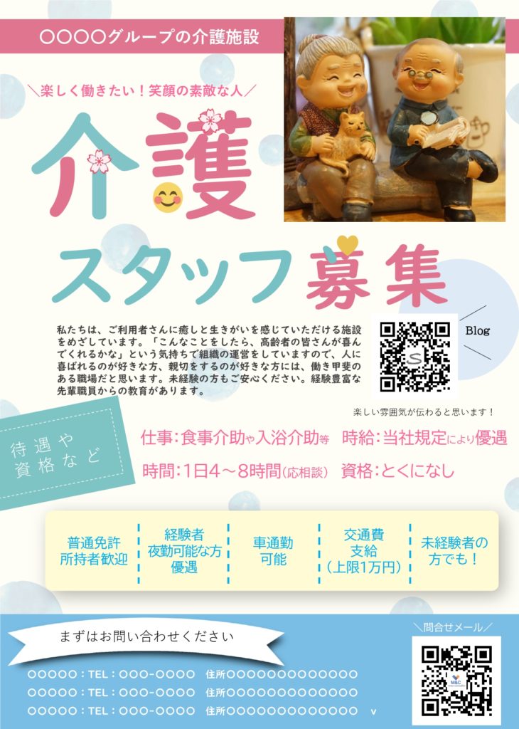 介護スタッフ求人チラシ案を作成しています。株式会社M&Cパートナーコンサルティング。