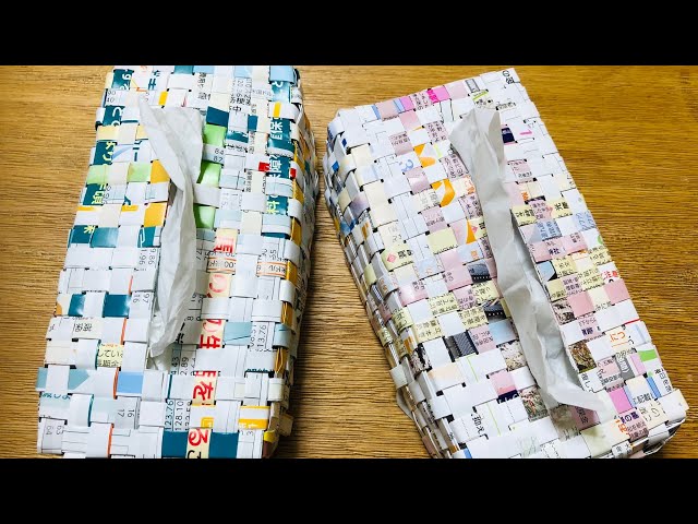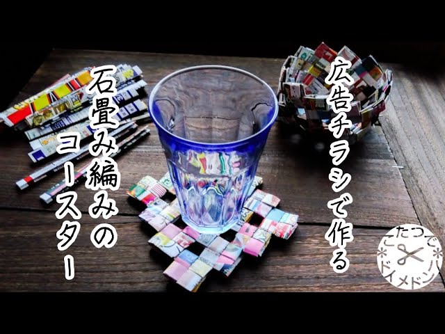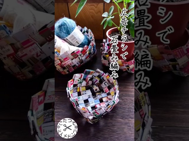 DIY 広告チラシでハンドメイド❋石畳み編みのカゴ作り❋こたつでハンドメイド ゆきんこチャンネル リサイクル手芸 アップサイクル 四だたみ折り小物入れ 籠。