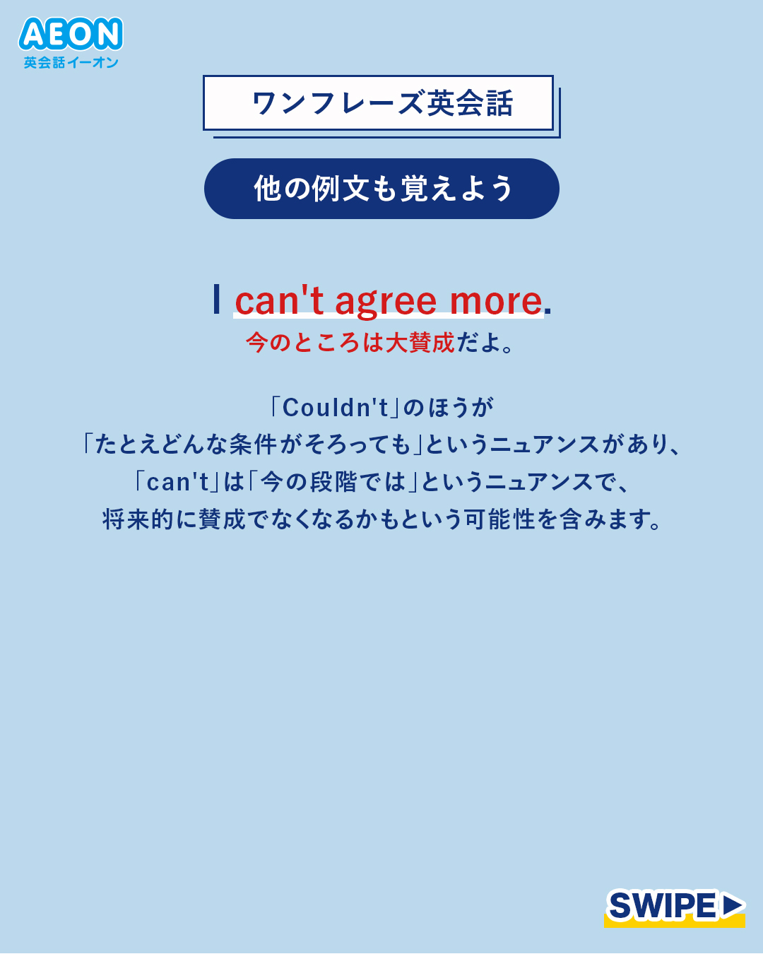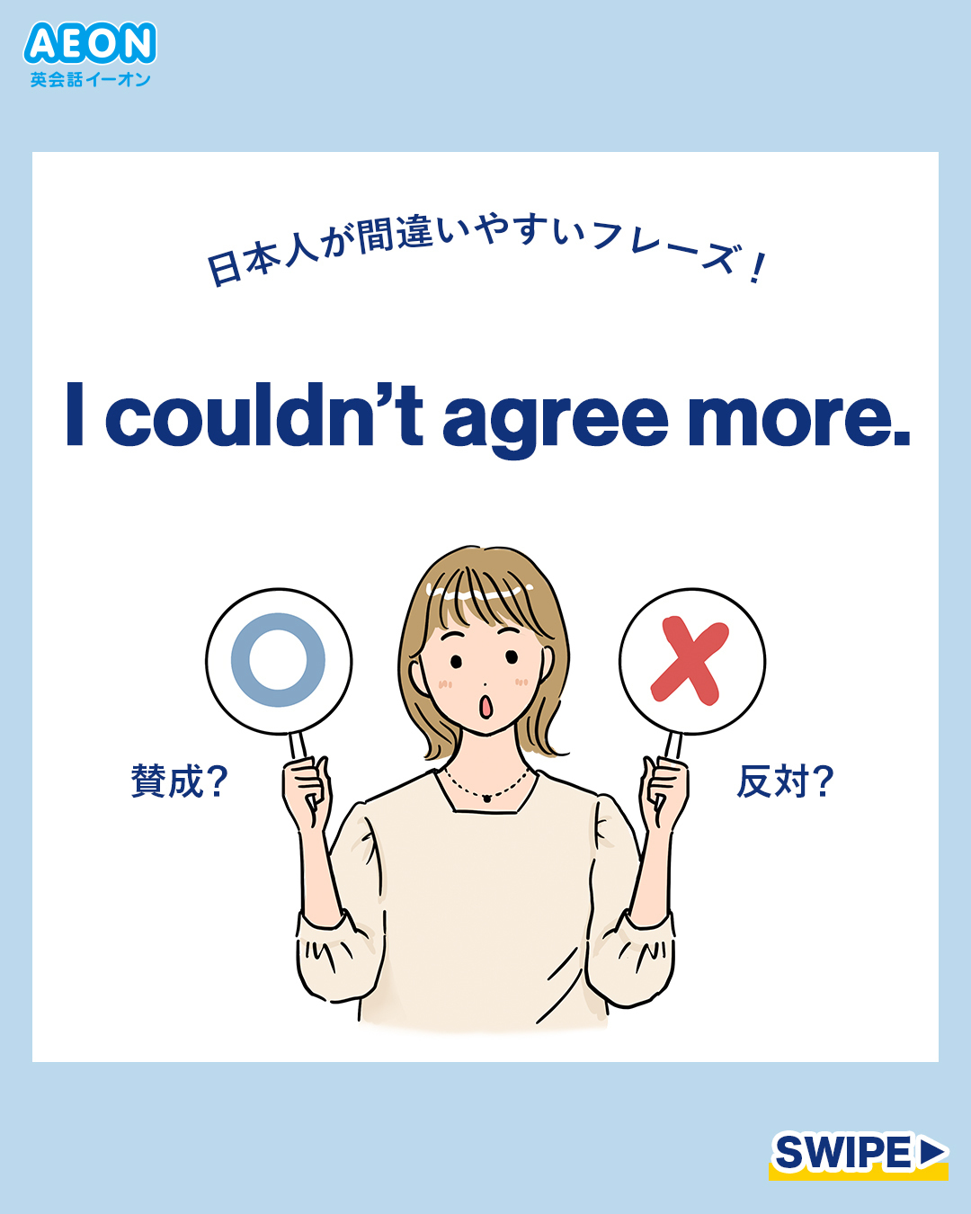 英会話イーオン 公式on X: "○日本人が間違いやすいフレーズ!○I couldn't agree more って賛成?反対?賛成という意味だと思う方は→⭕ マル反対という意味だと思う方は→❌ バツコメントで回答してみてね。