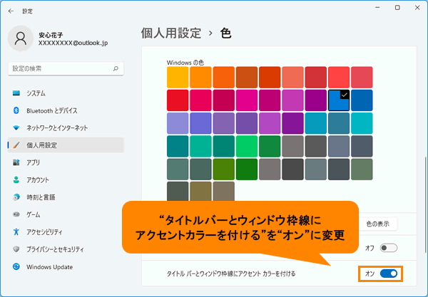 Windows 11 でタイトルバー、オン・オフ スイッチの色を変更する。