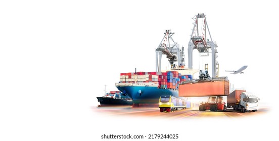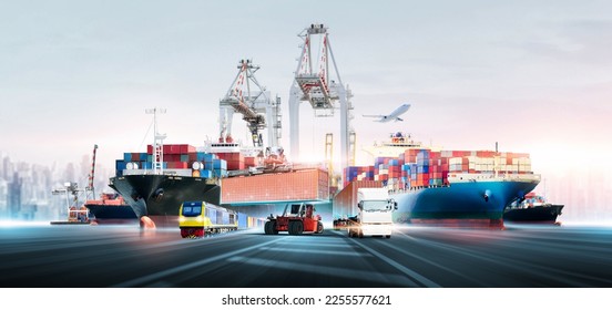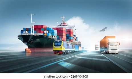 グローバルなビジネス物流と輸送の輸出貨物コンテナ貨物船、貨物列車、貨物飛行機、コピー空間と高速道路のコンテナトラック、国際貿易の概念写真素材2169404905Shutterstock。