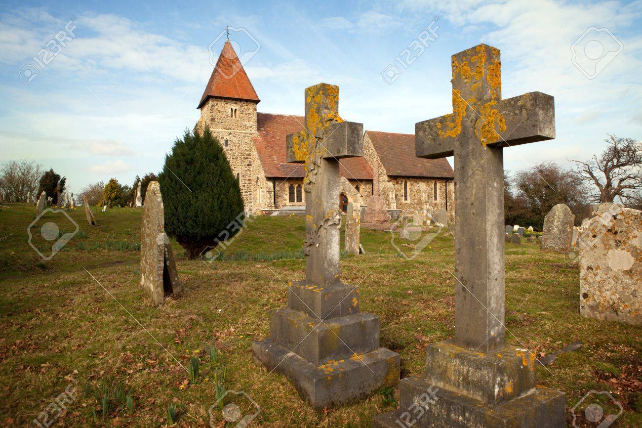 教会の墓地。英語村の教会 Guestling でセント ・ ローレンス川。イギリスのキリスト教の礼拝の伝統的な中世の場所の写真素材・画像素材Image 12877265。