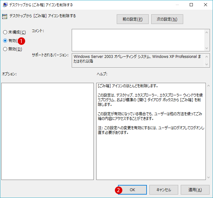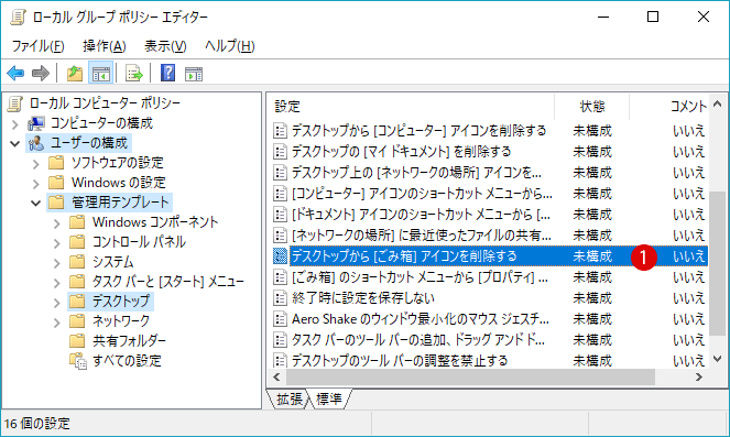 ごみ箱を非表示にする - Windows 10 ローカルグループポリシー gpedit.msc。