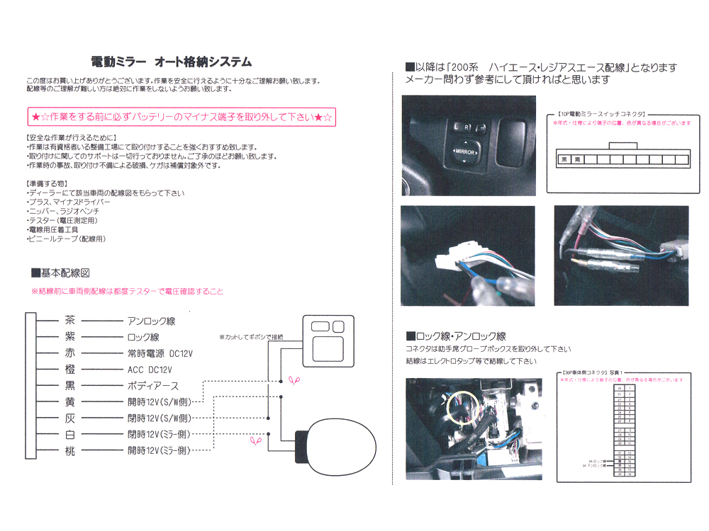 トヨタ ハイエース200系4型以降 電格ミラー後付ミラーSW配線 端子差込タイプ AmazonMOTOR POWER専用配線図付トヨタ200系 ハイエース 5型4型後期H29.11〜R2,5ドアミラー 自動格納キット 延長配線 ギボシ付 キーレス ACC 連動スマートキー。