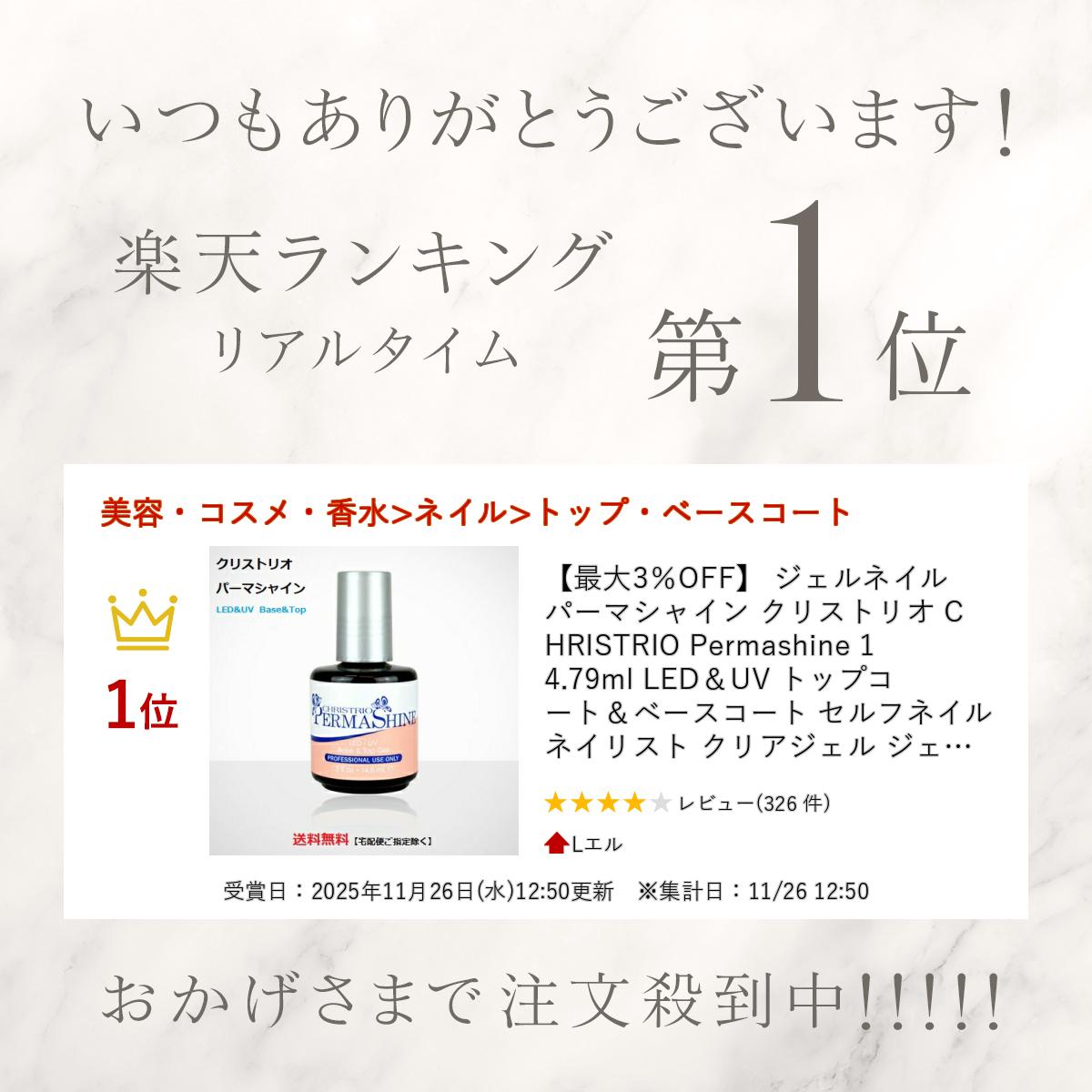 楽天市場最大3%OFFジェルネイル パーマシャイン クリストリオ CHRISTRIO Permashine 14.79ml LED&UV トップコート&ベースコートセルフネイル ネイリスト クリアジェル ジェラッカー gel nail ネイル 箱付き NEWパッケージ 新品 送料無料 : Lエル。
