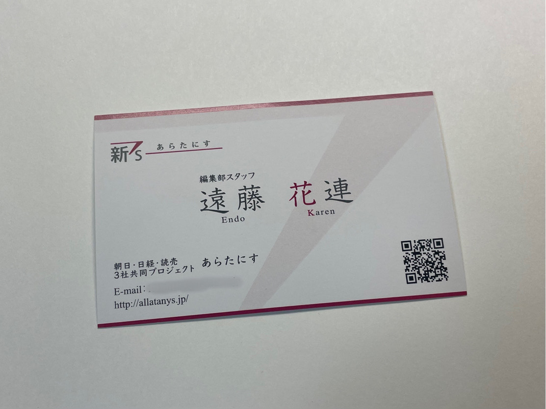 学生インターンの名刺が完成!デザインが得意な小笠原紘恵ちゃんに、学生インターンの名刺を作成してもらいました!それぞれのイメージに沿った、とても素敵な名刺ができあがりました! 裏面は個人の活動について記載しています。そちらもとても個性豊かで素敵です。