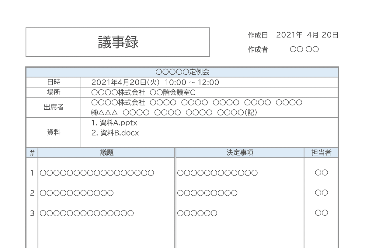 会議議事録 記入例・見本ありで書き方が簡単 Word・PDF・発信者や作成者・出席者の無料テンプレートをダウンロード。