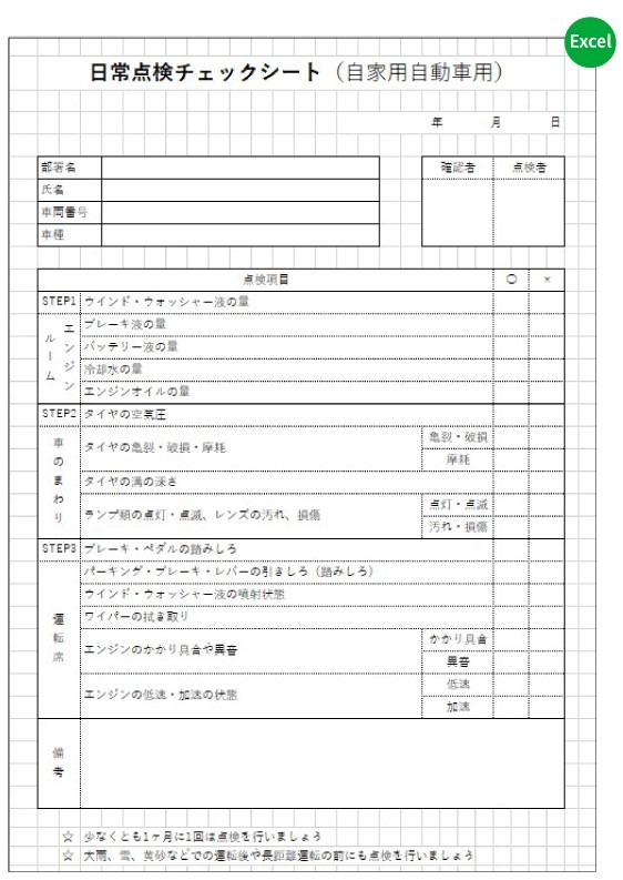 始業前点検表 Excel 無料テンプレート「00001」を使ってバックホウ・草刈り機・車などを安全に使える。