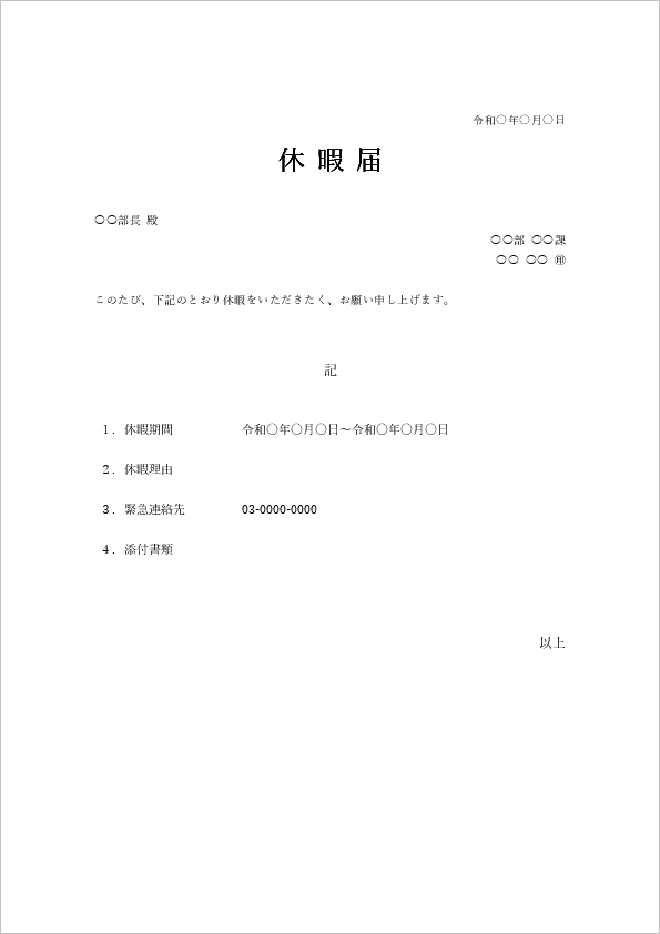 休暇届 休暇届け・休暇願い・休暇申請書 の書き方・例文・文例 書式・様式・フォーマット 雛形 ひな形テンプレート 無料 03 汎用表形式エクセルExcel-文書 テンプレートの無料ダウンロード。