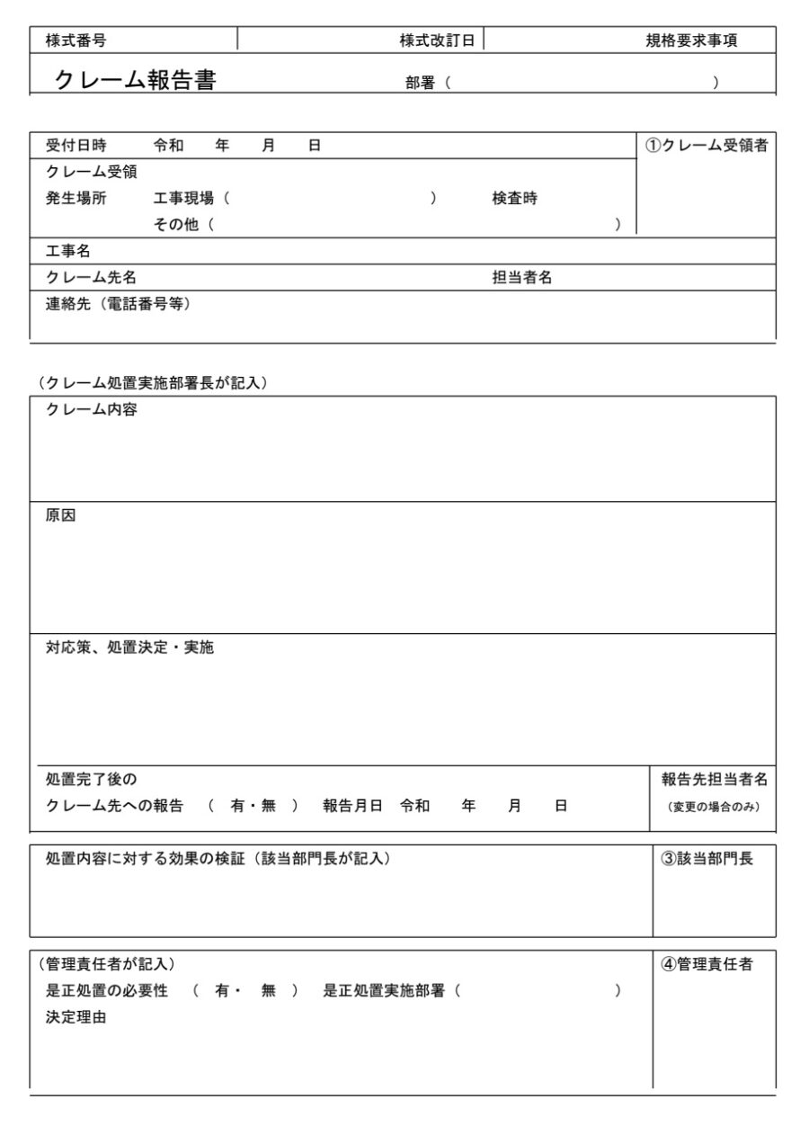 クレーム報告書 物件の工事 のテンプレート・例文:ワード Wordテンプレート・フリーBiz。