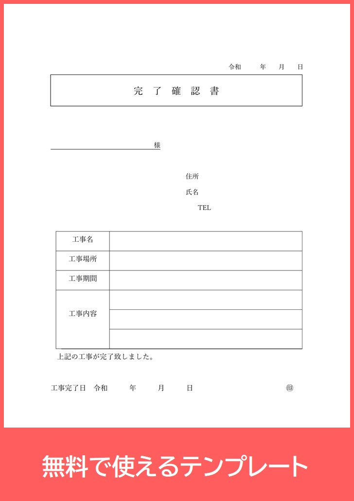 無料で使える!完了確認書のテンプレート! PDF A4印刷 工事に使える!書き方がシンプル!無料ダウンロード。