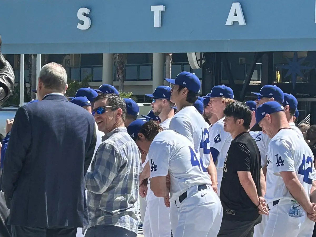 ジャッキー・ロビンソン像を囲み、セレモニーに参加するドジャース、ナショナルズの両軍選手 撮影・柳原直之- スポニチ Sponichi Annex野球。