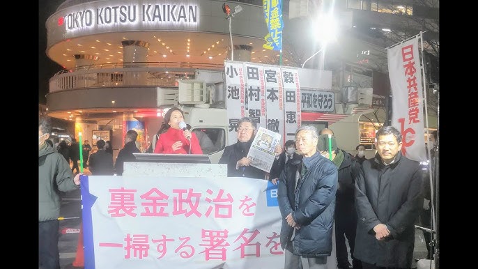 自民裏金は組織的犯罪 金権腐敗の根断つ本当の政治改革を 東京・有楽町 田村委員長ら緊急宣伝。