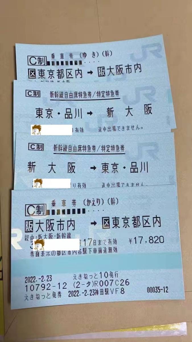 東京~新大阪 日付変更可 東海道新幹線チケット 往復 自由席乗車券+。