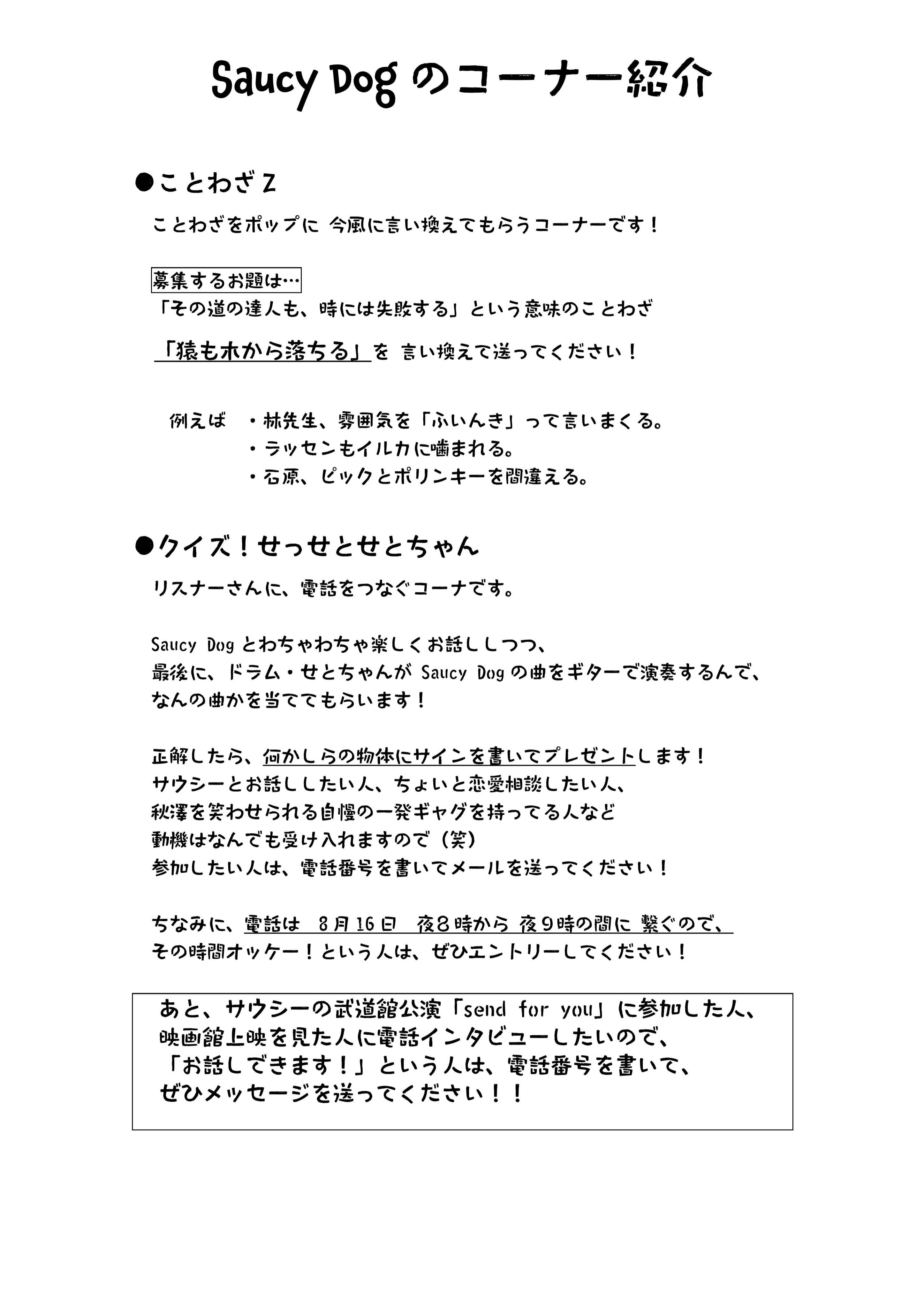 Saucy Dog on X: "RT @THEKINGSPLACE: 🐕サウシー通信🐕 今日慎也1時からSaucyDogのキンプレが始まりますが、コーナー情報を漏洩します🐶犬の絵文字めっちゃある🐩メンバーへの質問や相談メッセージもさっそく読みます🐃さっそく送って下さい!ことわざZはさっそく明日。