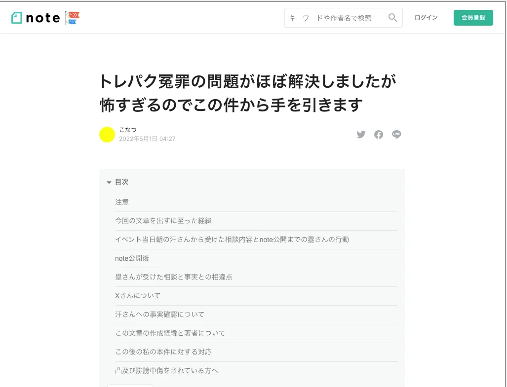 こなつがトレパク事件後に発表したnote「トレパク冤罪の問題がほぼ解決しましたが怖すぎるのでこの件から手を引きます」のアーカイブ - トレパク データベース。