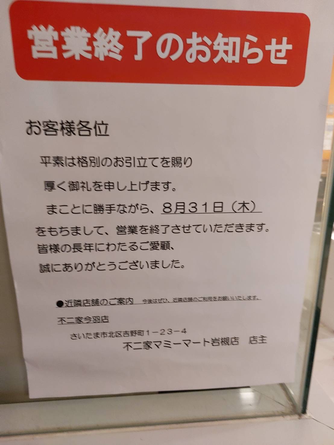 さいたま市岩槻区 残念ながら、8月31日 木 の営業をもって「不二家 マミーマート岩槻店」が閉店してしまうそうです。号外NET さいたま市見沼区・ 岩槻区。
