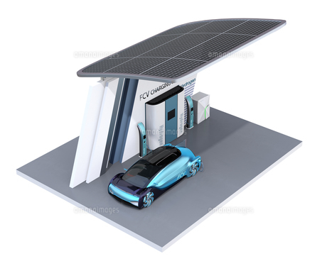 ソーラーパネルが備えている水素ステーションに水素ガスを充てんしている自動運転FCVのイメージの写真素材FYI04646225ストックフォトの Qlean Market キュリンマーケット。