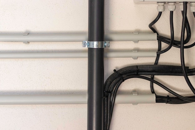 PVC電線管と防水コネクタボックスを備えたプロフェッショナルな屋外電気配線壁設置Premium写真。