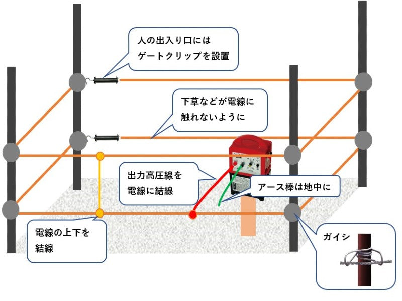 電気さくの有効な設置方法と維持管理についてタイガー株式会社鳥獣被害対策機器 爆音機 電気さく 捕獲器エアー剪定鋏。