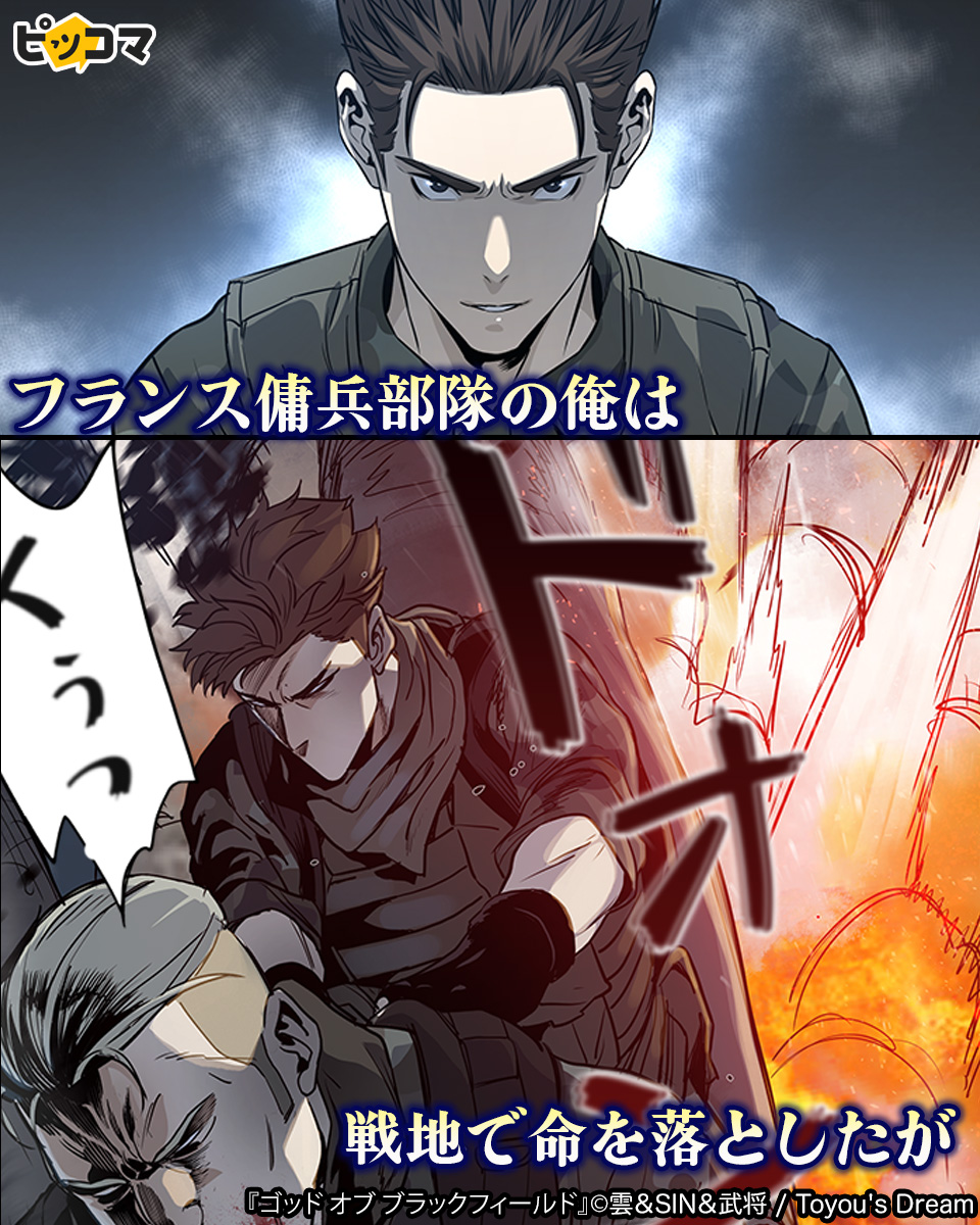 \無料マンガ , 最強の傭兵が少しワケアリな高校生に憑依して, 『ゴッド オブ ブラックフィールド』ピッコマFacebook。