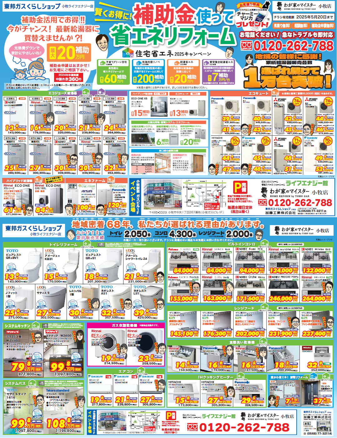 6月の折り込みチラシは、「2025年補助金を使って省エネリフォーム」10年以上お使いの機種の取替をおすすめします。今なら、お得な補助金をうまく使って交換費用を節約しましょう。–東邦ガスくらしショップ 加藤工業 小牧市、大口町、扶桑町、犬山市ガス機器!修理。