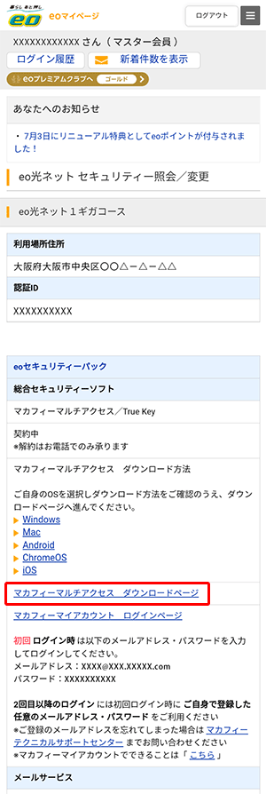 マカフィー マルチ アクセス インストール方法 iOS eo光。