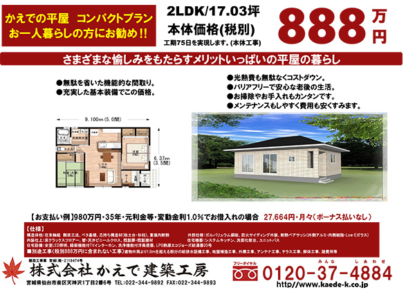 一人暮らしに人気「小さい平屋」間取りのポイント1LDK~2LDKの間取り図と価格実例注文住宅ブルーハウスデザイン・性能・リゾートライフ、愛知、名古屋、豊橋、豊川、岐阜ならお任せください。