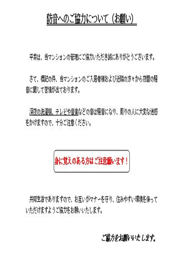 騒音注意文の正しい書き方や例文を紹介騒音トラブルを一刻も早く沈静化させるために知っておくべきポイントとリスク - GMO賃貸DX。