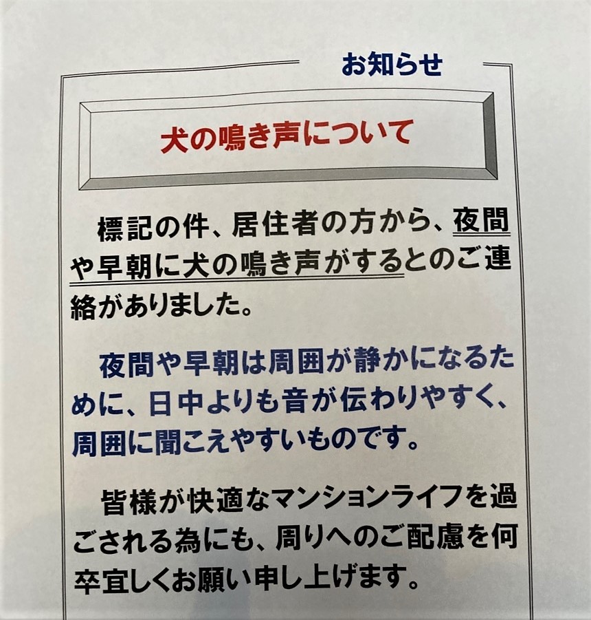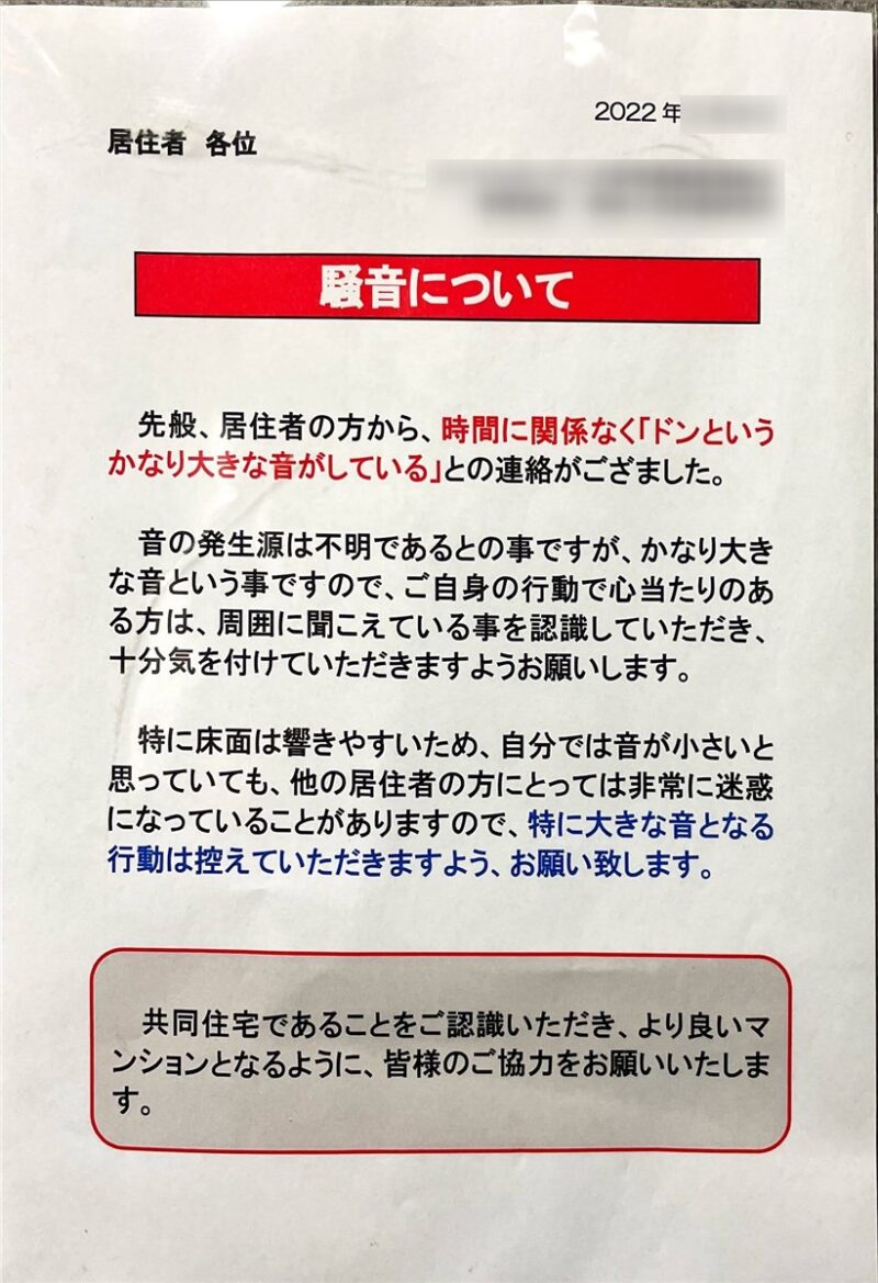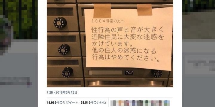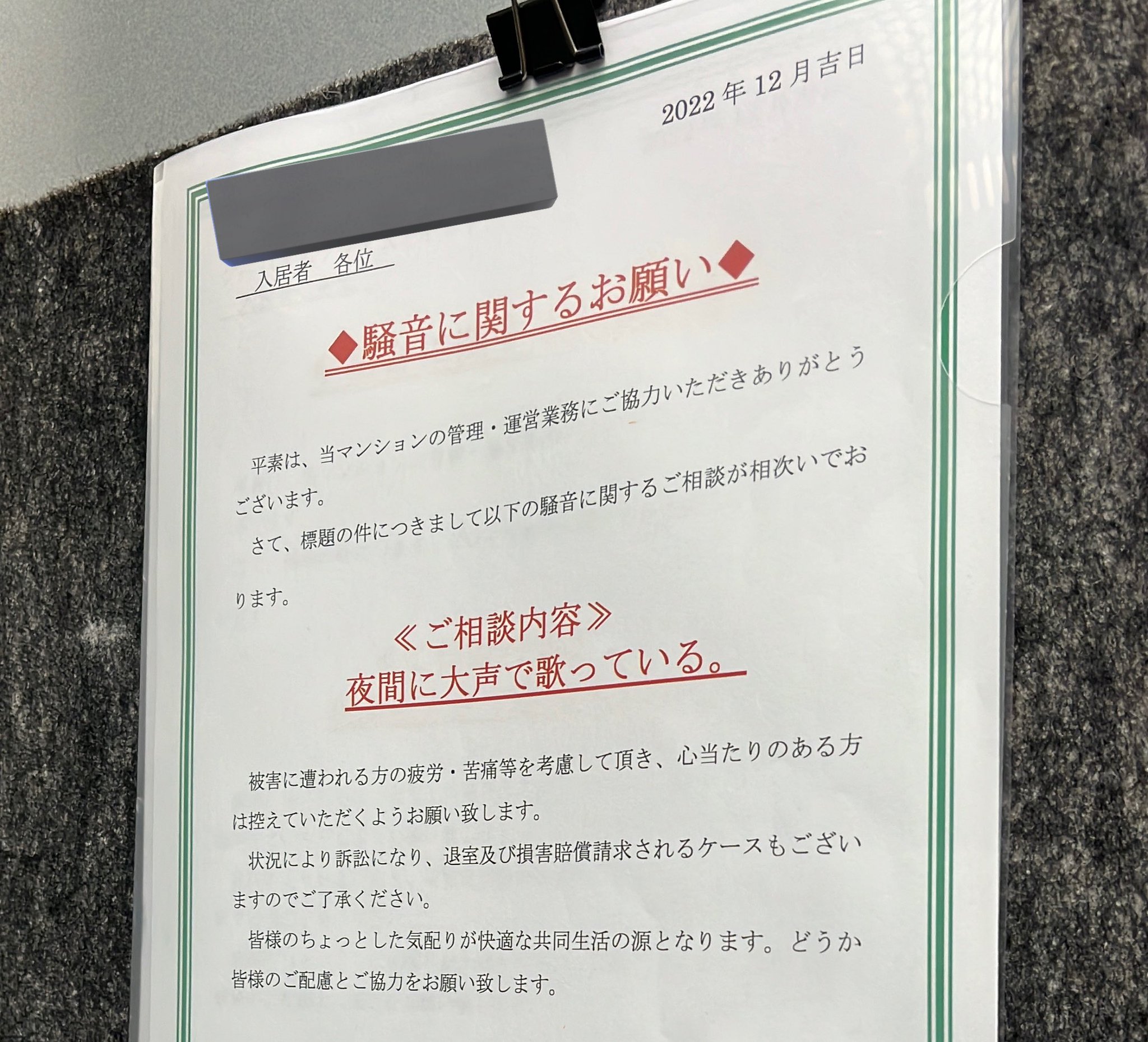 マンション住民からの「○行為」の騒音のクレームの張り紙www。