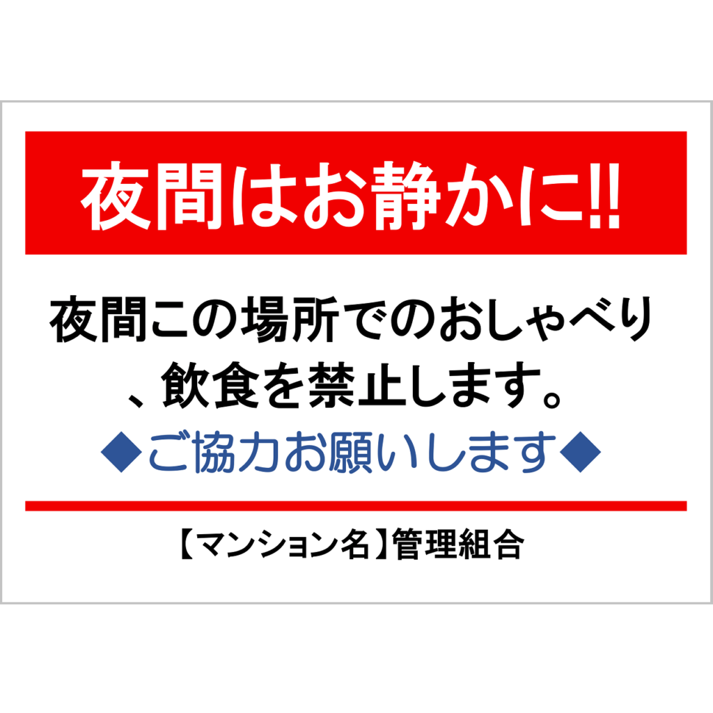 すぐに使える 夜間騒音禁止の張り紙・無料Excelテンプレート~A4・ヨコ・夜間・マンション共用部分~Plusプロジェクトマネージャーオフィシャルページ。