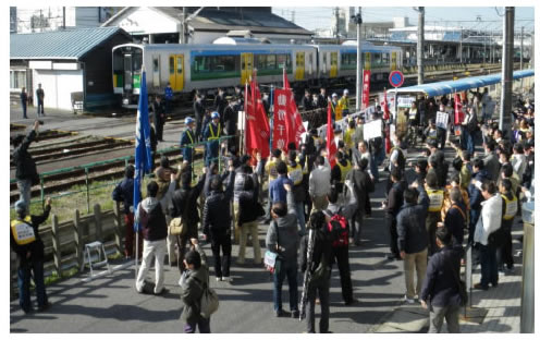 今、ワンマン化したら 事故がおきるのは目に見えている”―3.16ダイ改国鉄千葉動力車労働組合。