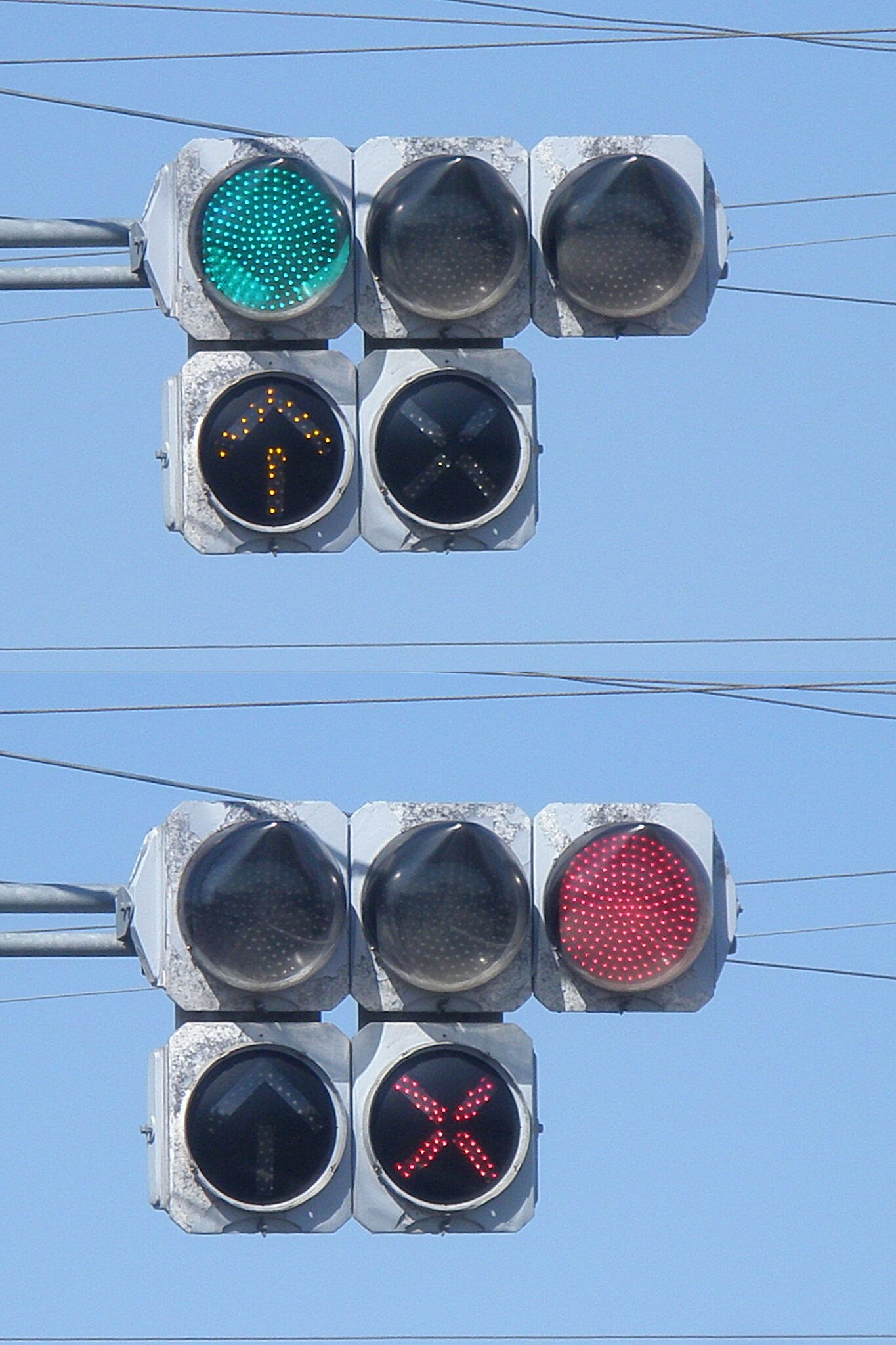 File:LEDレンズ式路面電車用信号機 2枚合成、上:青信号・黄色矢印、下:赤信号・赤×印 .jpg - Wikimedia Commons。