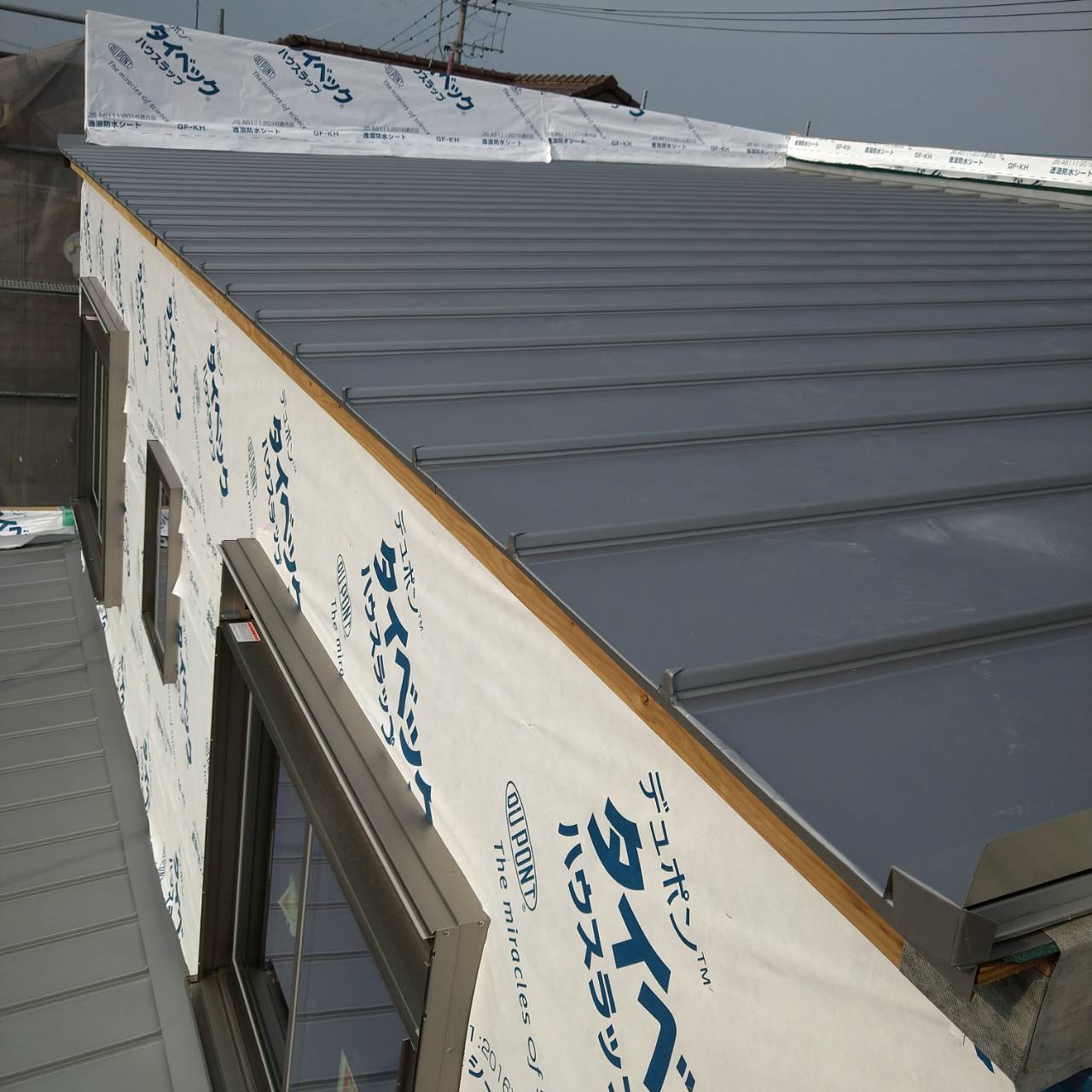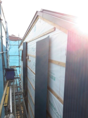 外壁 新築住宅の外壁をガルバリウム鋼板のカバールーフで施工していきます。