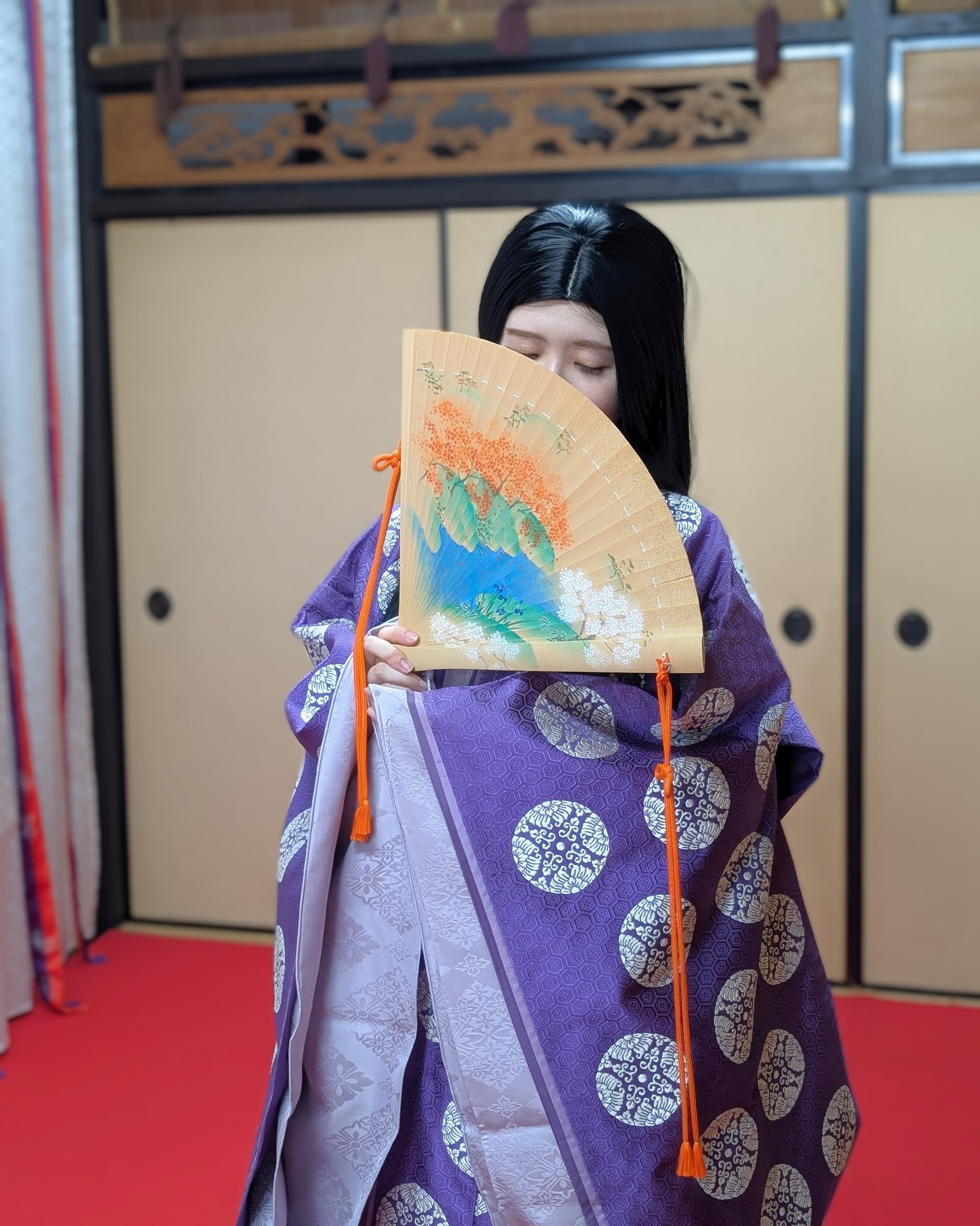 扇で顔を隠した平安の美女♪十二単と着物レンタルの雅ゆきで結婚式・京都観光。
