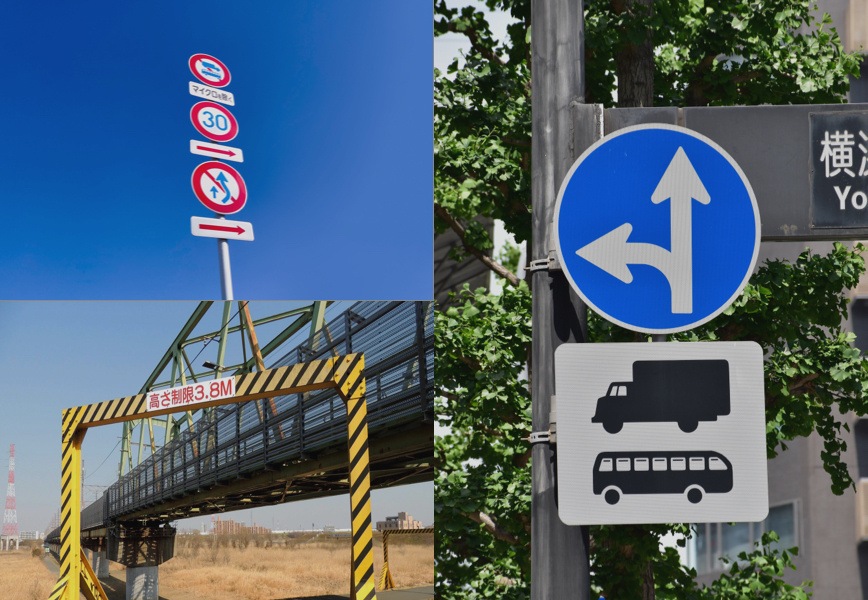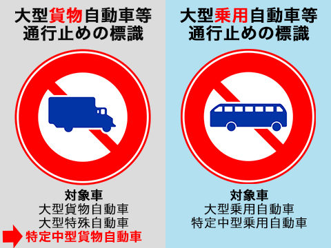 図解付き 大型貨物・大型乗用の通行止め標識を見分けるポイント。