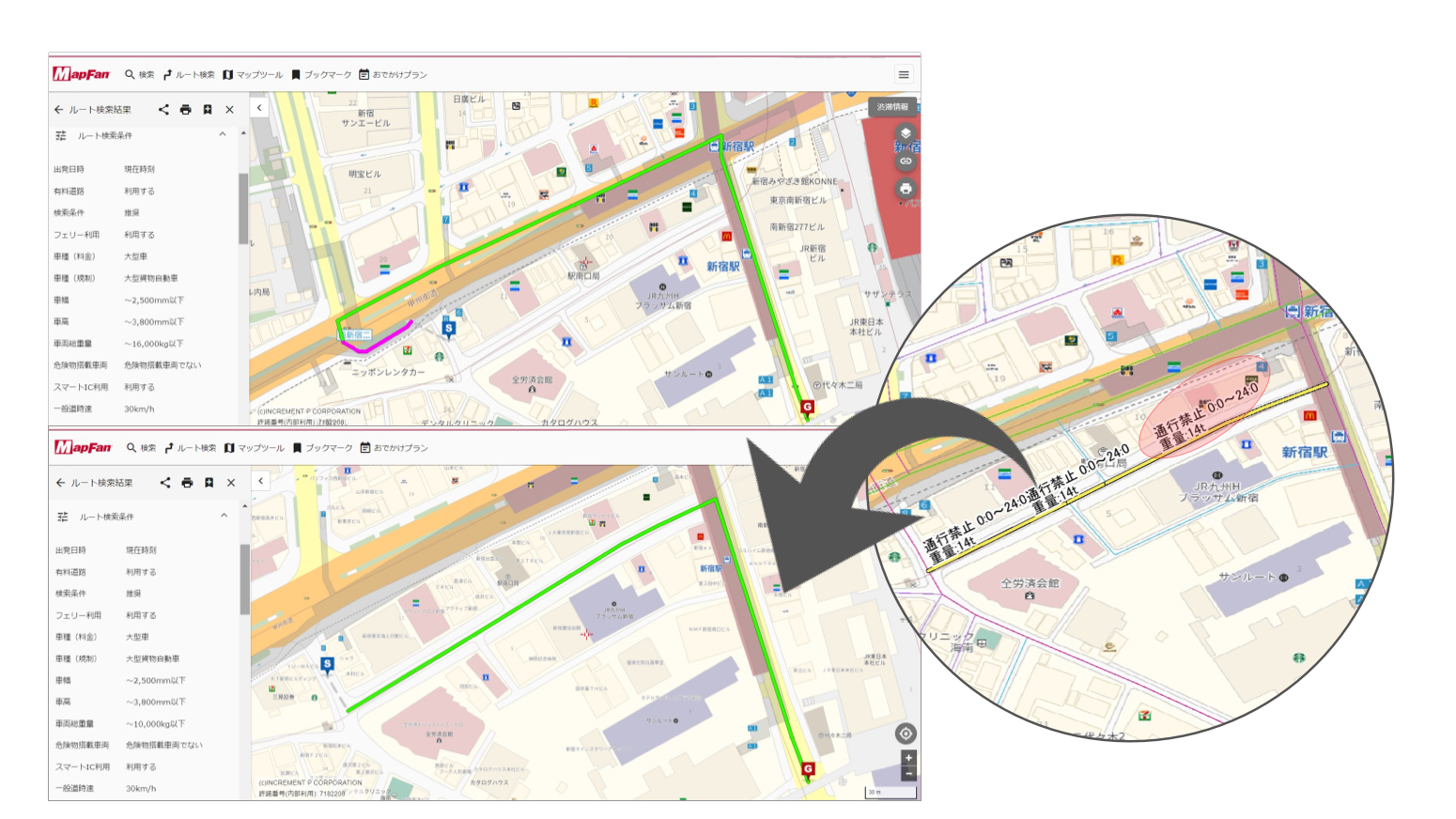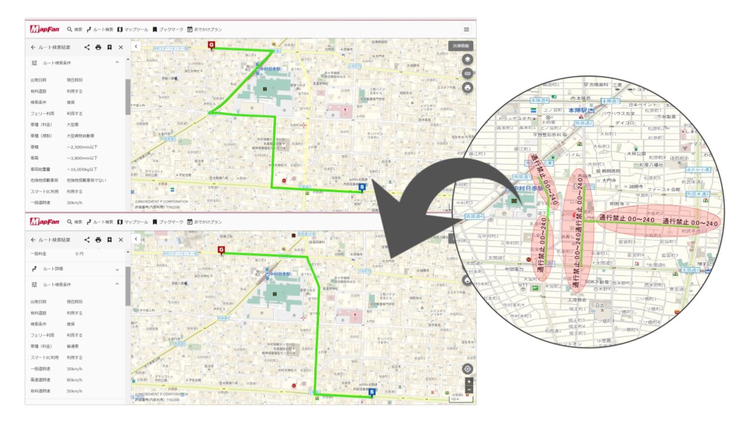 大型車進入禁止などの規制情報を簡単に調べる方法やMapFanが持つ約40万件の規制データを紹介します。ジオテクノロジーズ MAP WORLD+。