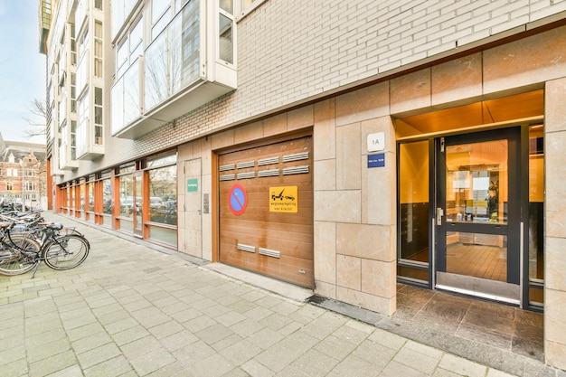 スーパーの看板のある青い建物の正面Premium写真。
