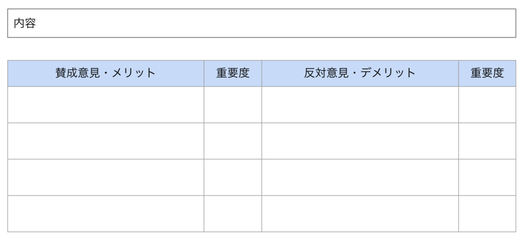 無料テンプレート プロコン表 Pros and Consとは?意味と活用方法。フレームワークをテンプレート付きで書き方を解説。 見本・サンプル付き- Dolly Blog。