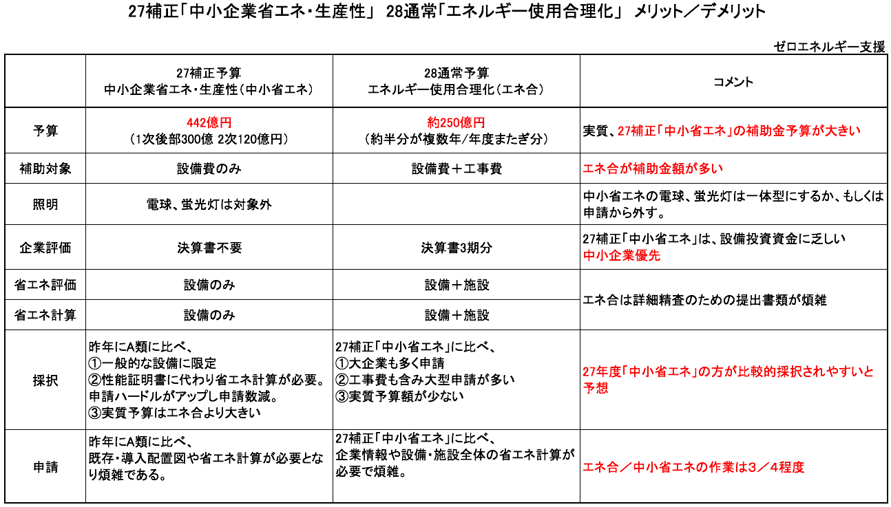 比較 メリット・デメリット 27年補正「中小企業省エネ」 28年度「エネルギー使用合理化」ブログゼロエネルギー支援。