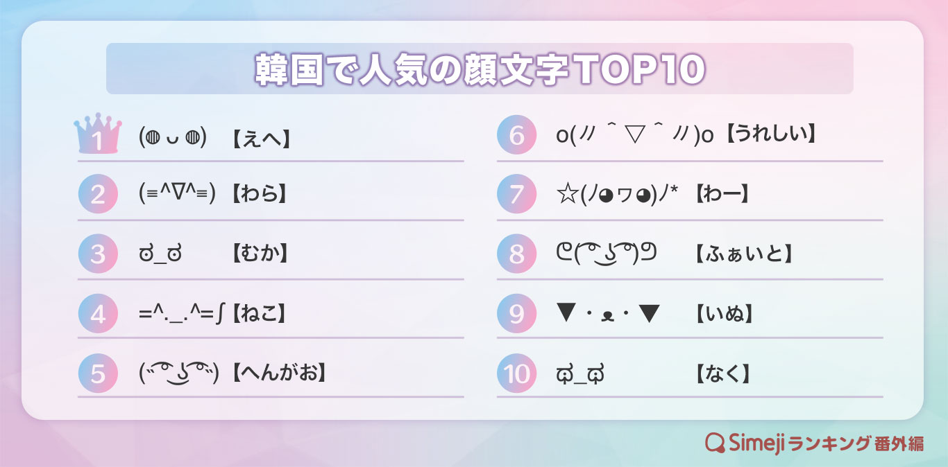 Simejiランキング番外編 「韓国で人気の顔文字TOP10」Baidu Japan バイドゥ株式会社。