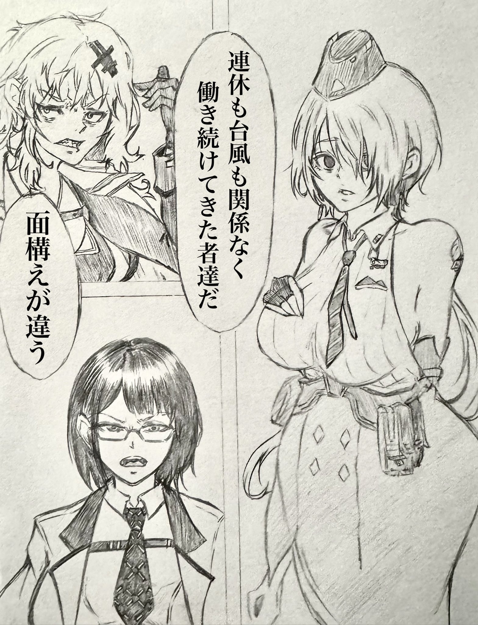 猫舌 on X: "面構えが違う。のNIKKE社畜パロディを落書きしてみたよ😂一応ブリッド、ユルハ、マナのつもりです。雑だから分かりづらいかもですが。3人描くのしんどすぎた、最後のマナさんは特に適当に描きすぎてしまって反省 ごめんね😇面構えが違うNIKKE好きと。