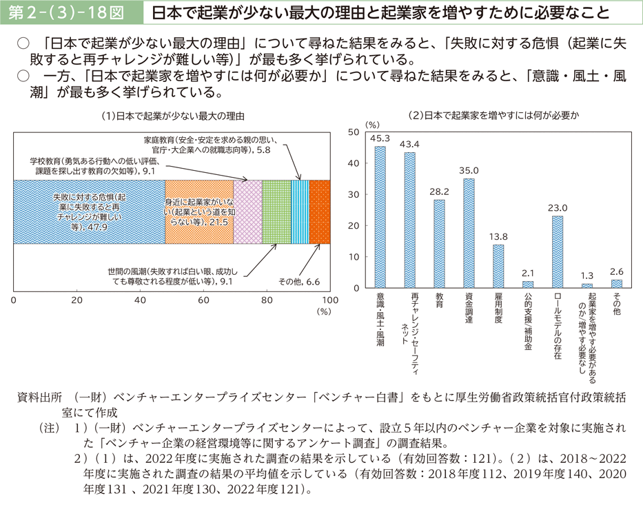 第2- 3 -18図 日本で起業が少ない最大の理由と起業家を増やすために必要なこと令和5年版 労働経済の分析 -持続的な賃上げに向けて-厚生労働省。