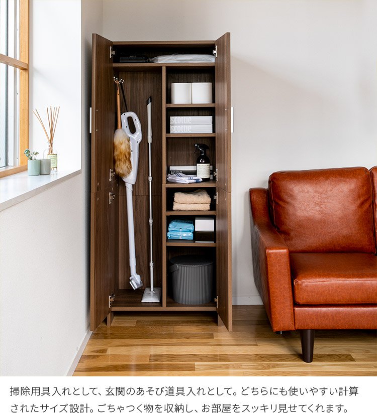 掃除機収納庫 幅60 高さ150 北欧 おしゃれ インテリア クローゼット 収納ラック 扉付き 収納棚 掃除道具 おしゃれ家具 収納家具 玄関 収納庫用具入れ リビング 収納 洗面所 ルームクリーン ほうき モップ ハンディークリーナー 雑巾 バケツ 脚立 清掃用品 掃除用品 隠せる。