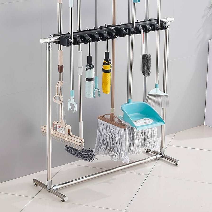 モップハンガー モップホルダー モップ 収納 掃除用具入れ 掃除用具収納 掃除 清掃 掃除用品 掃除用具 掃除道具 保管 大容量 バケツ 回転モップキャスター付き キャスター付 キャスター ちりとり 雑巾 高さ調節可能。