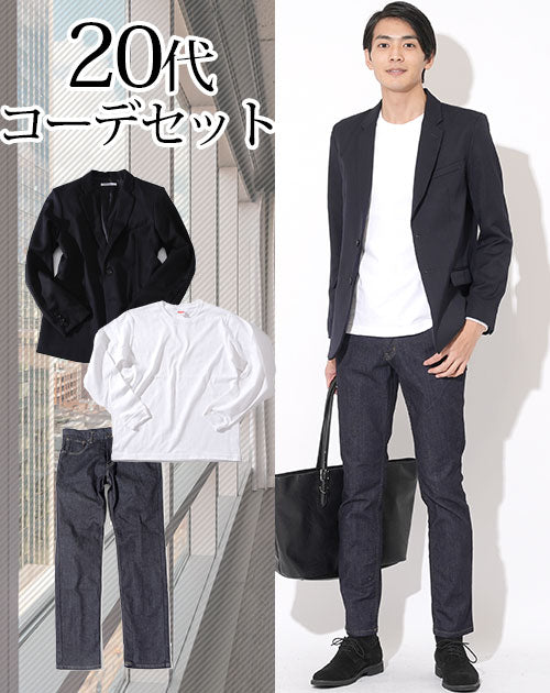 オフィスカジュアル スマートカジュアル メンズ 男性 春 秋 20代 後半 前半 社会人 新卒 大学生 3点コーデセット 黒ジャケット×ネイビーシャツ×ネイビーデニムパンツメンズファッション きれいめ ドレスコード ホテル 高級 レストラン 婚活 デート 同窓会 結婚式二次会。