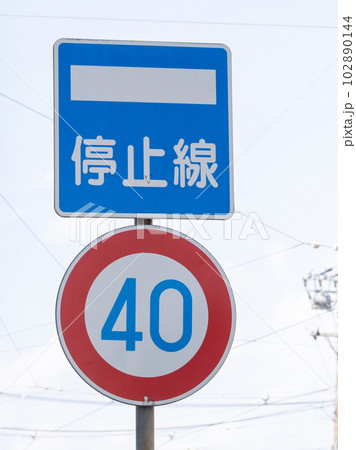 道路標識。指示標識「停止線」と規制標識「最高速度」。の写真素材102890144- PIXTA。
