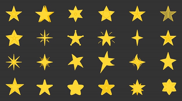 黄色の星のアイコンを設定します。 Webサイト、ピクトグラム、アプリ のフラットシンプルなグラフィック星空要素コレクション。ゲームでの賞として、さまざまな形の漫画の星。Premiumベクトル素材。