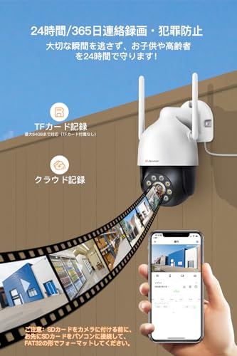 楽天市場 防犯カメラ 屋外 500万画素 監視カメラ wifi ワイヤレス 人体検知 自動追跡 355° PTZ旋回 5倍光学ズーム 夜間カラー撮影50mまで暗視撮影 IP66防水 双方向音声通話 動体検知 警報通知 遠隔監視 MicroSDカード録画 IP ネットワークカメラ日本語アプリ説明書対応。
