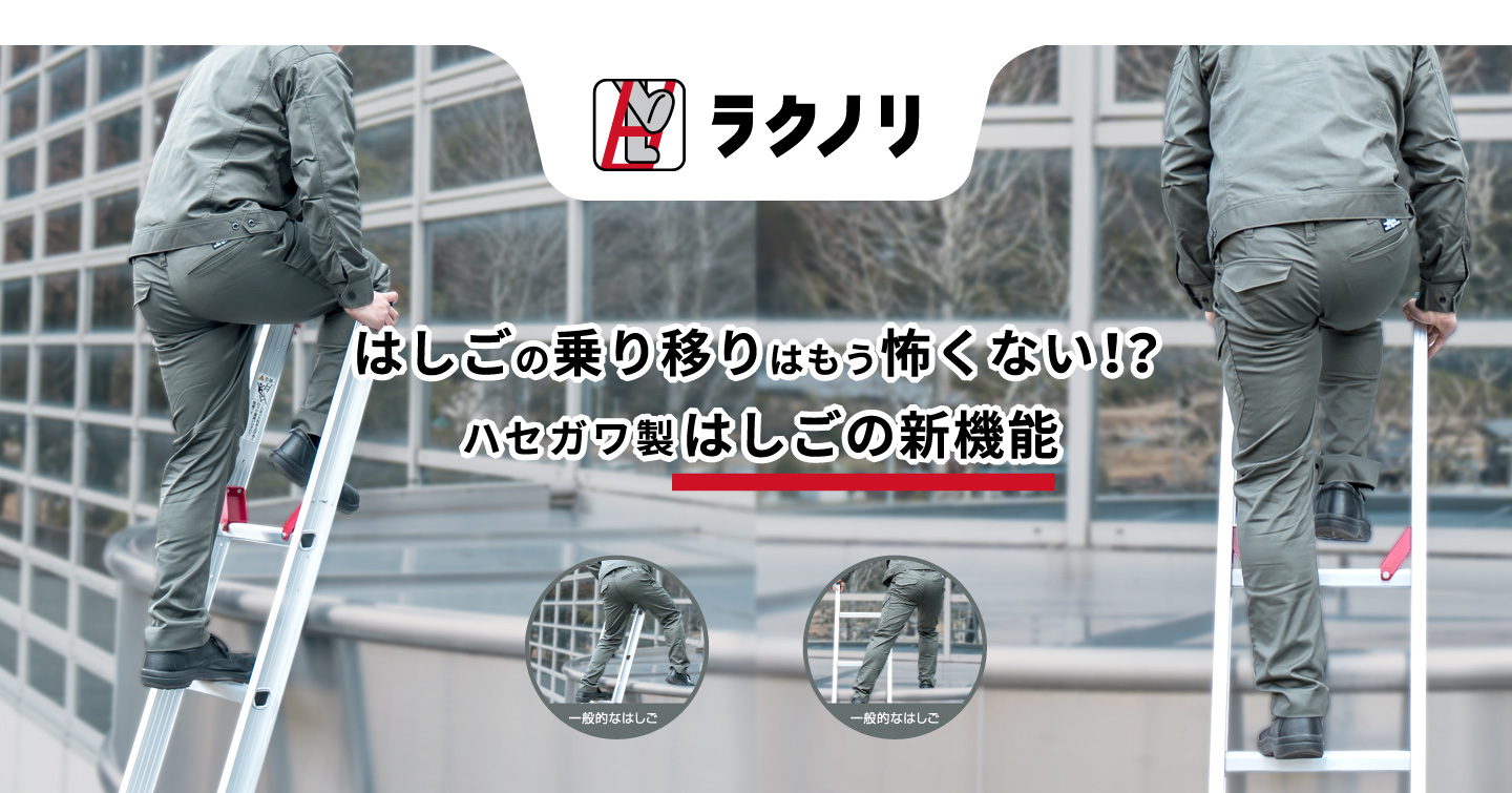 はしごの乗り移りはもう怖くない!?ハセガワ製はしごの新機能「ラクノリ」梯子、脚立のパイオニア 長谷川工業株式会社。